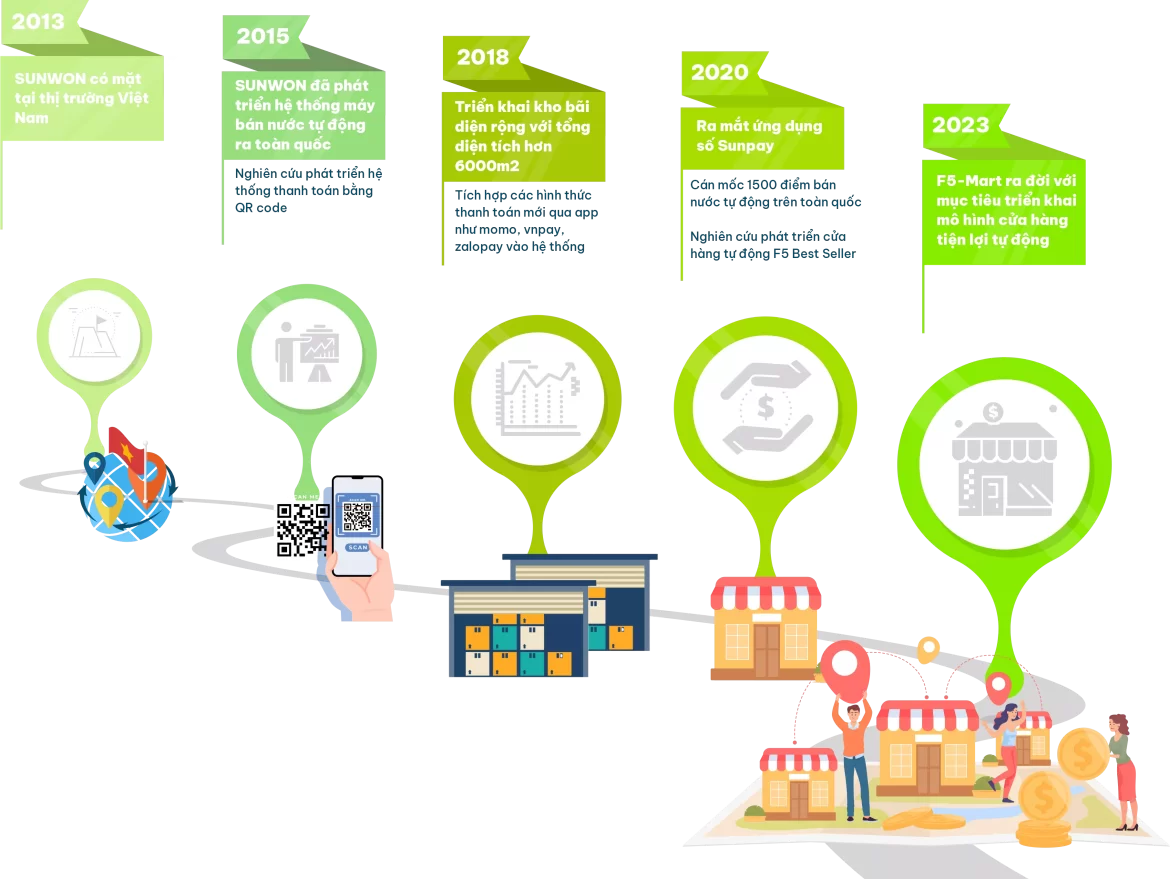 Năm 2015, Tập đoàn Sunwon đã phát triển hệ thống máy bán nước tự động ra toàn quốc với hơn 500 điểm bán tại các thành phố lớn như TPHCM, Đà Nẵng, và là đối tác chiến lược của các tập đoàn lớn như: SAMSUNG, HONDA,VINGROUP, LG, VIETTEL, các cơ quan nhà nước nước, các bệnh viện lớn tại Việt Nam.